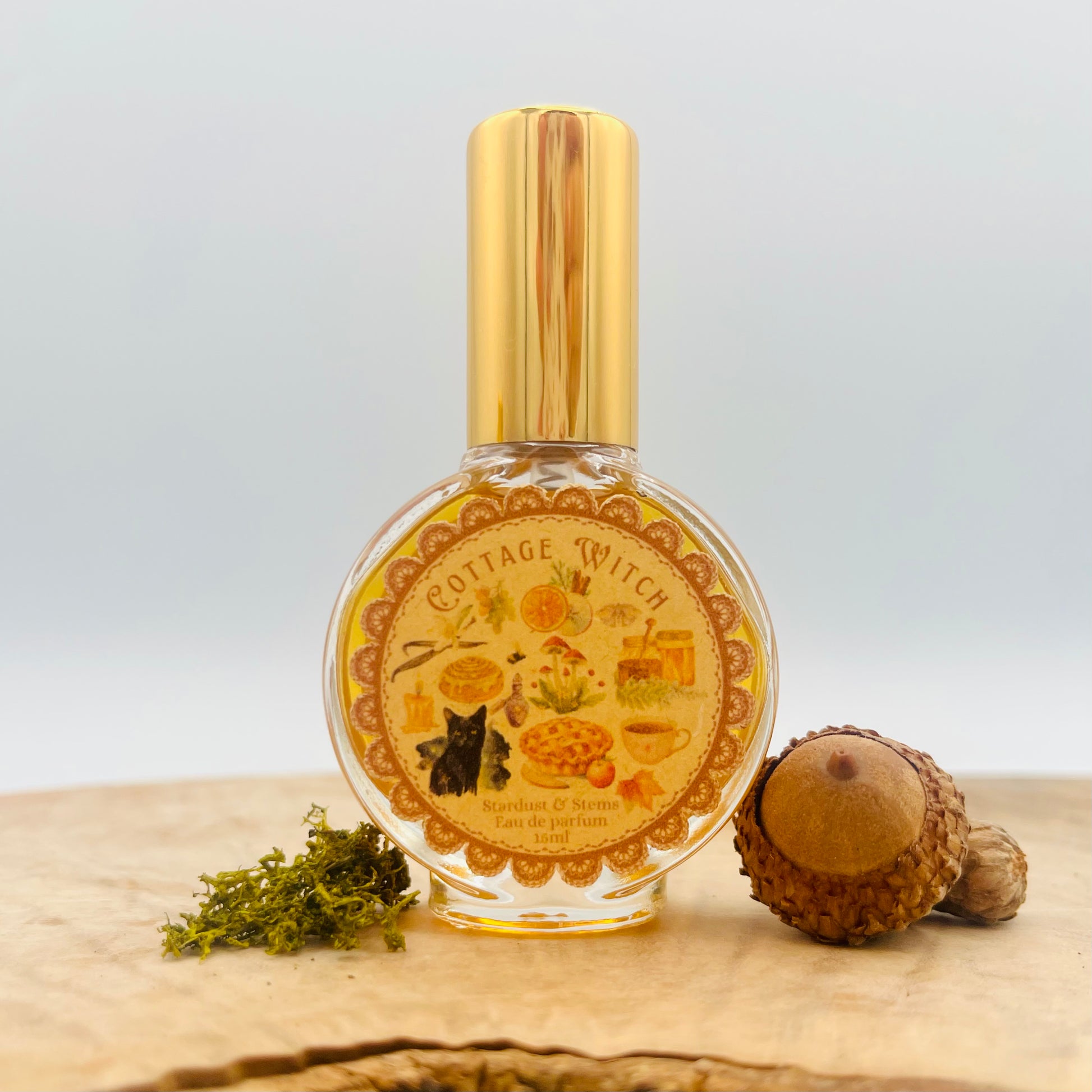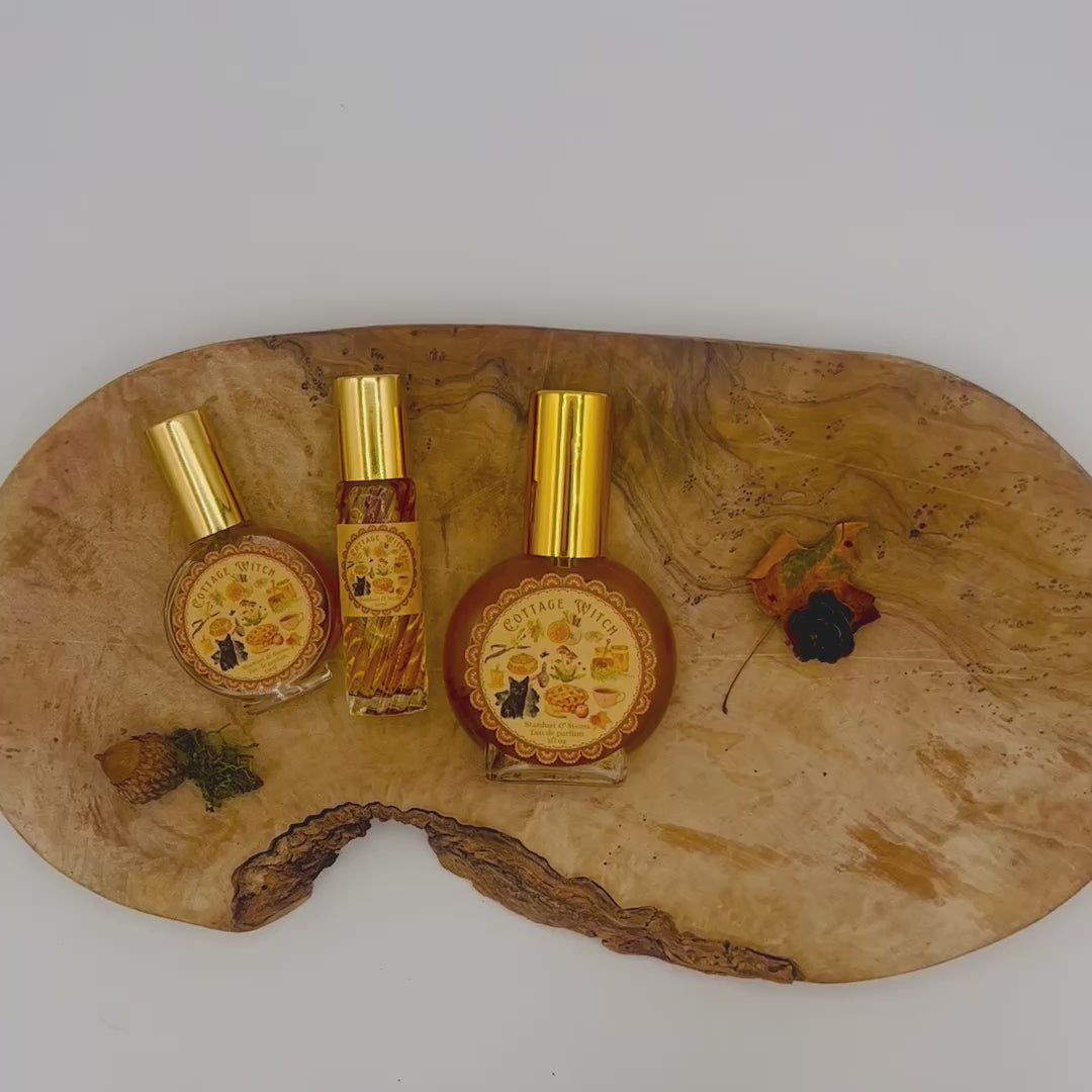 Tucked deep in a mossy hollow, where ancient oaks cradle secrets and cinnamon buns seem to grow warm and sweet from their knotted boughs, lives the cottage witch. She tends to gentle charms — stirring sugar into cream, blessing wandering souls with warmth, and weaving spells of hearth and honey. Cottage Witch is your fragrant incantation for crisp mornings and firelit nights: orchard fruit and spiced pastry drifting through old wood, wildflower honey drizzled onto fresh bread, and a swirl of vanilla and soft musk wrapping you like a beloved quilt.