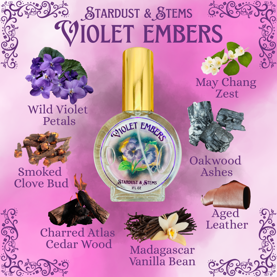 VIOLET EMBERS- May Chang Zest, Oakwood Ashes, Wild Violet Petals, Smoked Clove Bud, Madagascar Vanilla Bean, Aged Leather, Iso E Super, Charred Atlas Cedar Wood